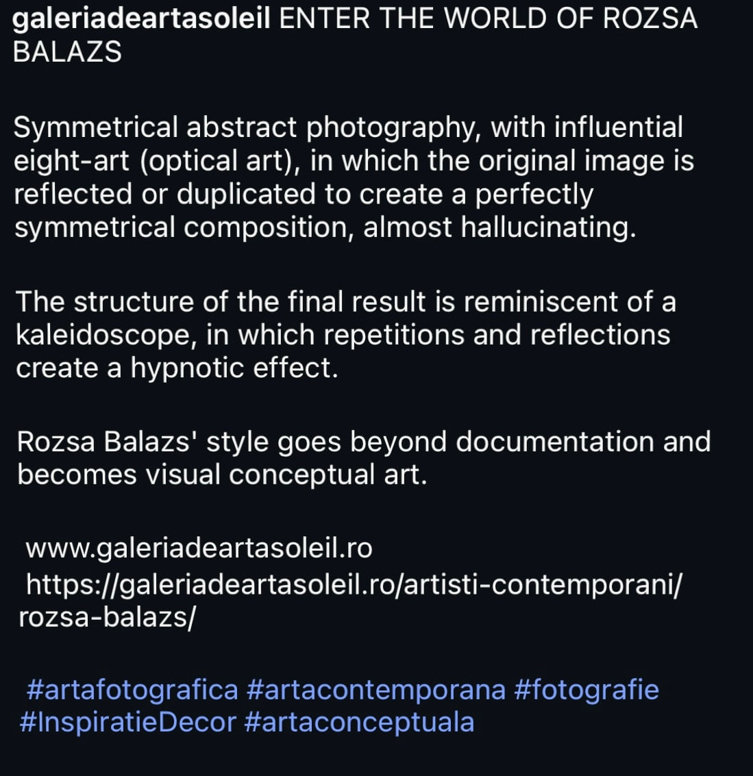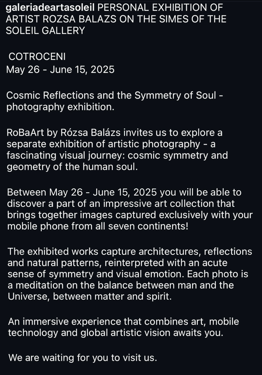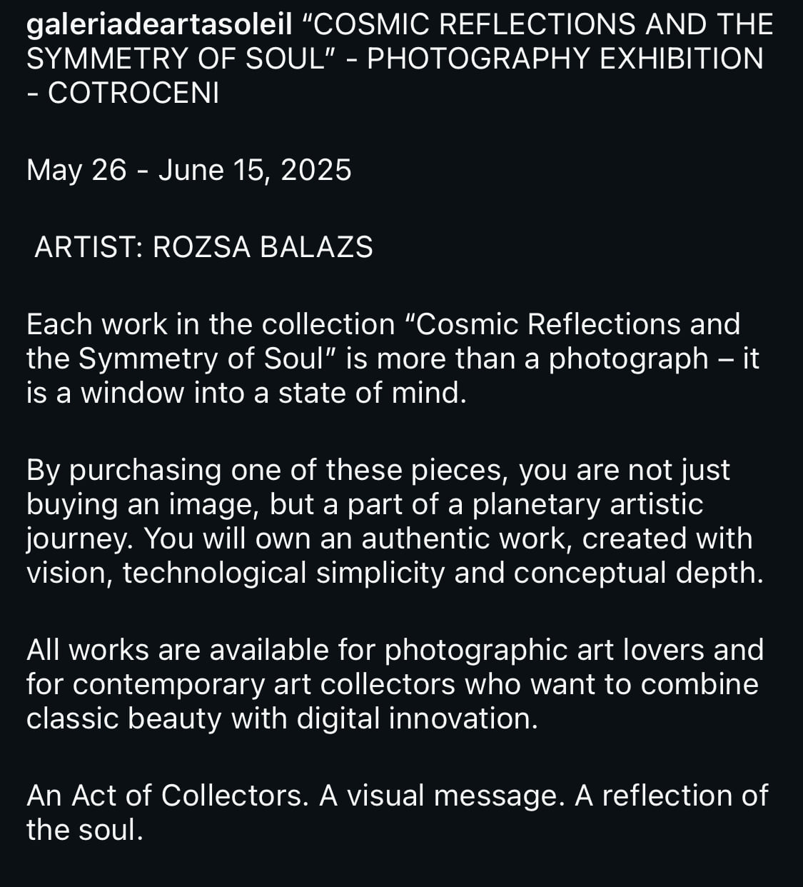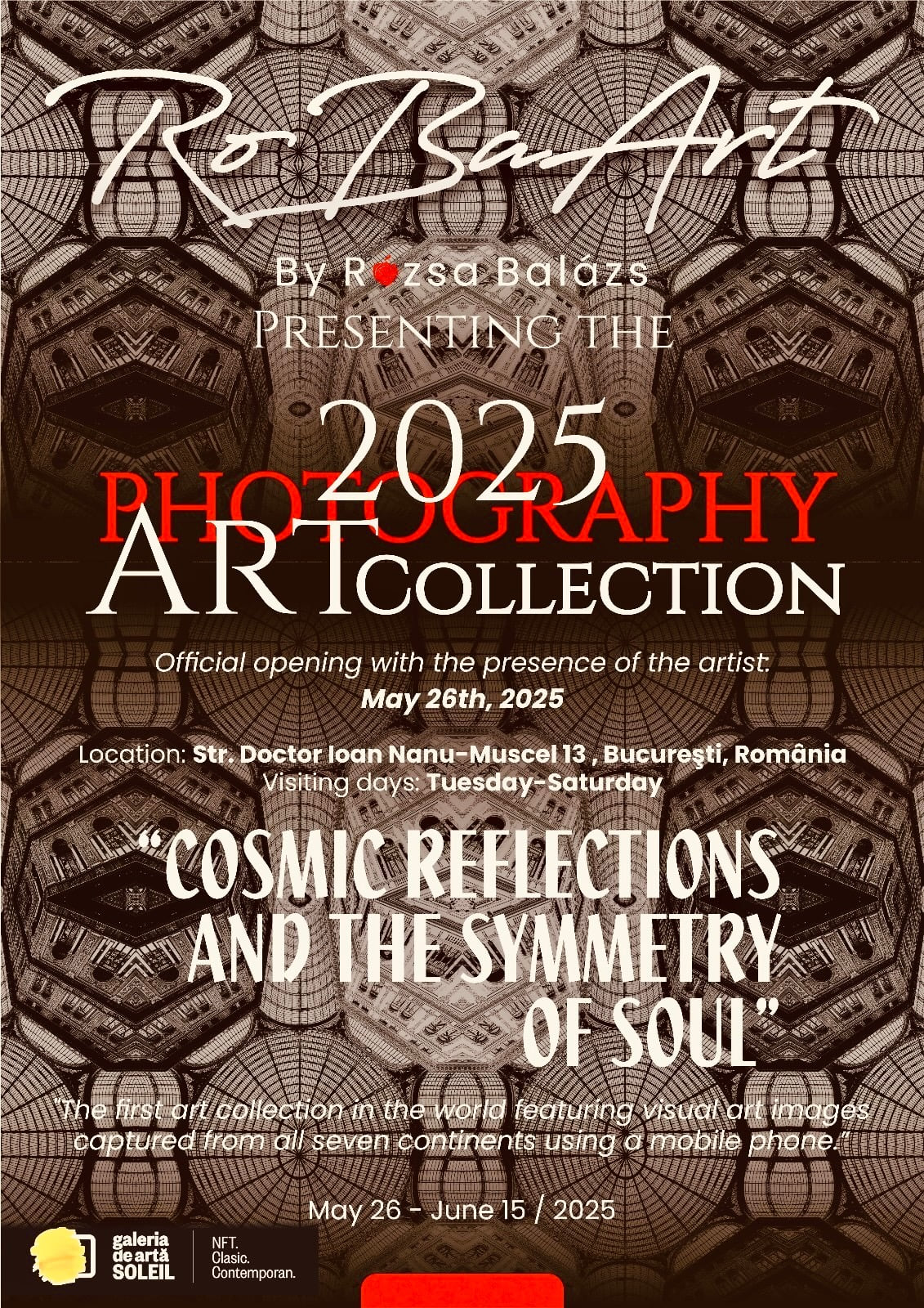 “Cosmic Reflections and the Symmetry of Soul”, Exhibition dates: May 26 – June 15, 2025 Location: SOLEIL ART Gallery, Bucharest. Official opening: Friday, May 26, 7 PM, in the presence of the artist.